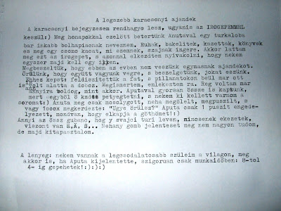 Fáradtan benyitok a házba, hátamon egy ÓÓÓriási táska, a kezemben egy könyvekkel teli szatyor és a "retikülöm", ami inkább egy "kofferre" hasonlít. Egy doboz és egy hatalmas Mikulás csizma vár. Kiabálnak a fiúk, hogy húzzak egy cetlit a dobozból. A cetlin egy kettes szám áll; az enyém a kettes Mikulás csomag:)) Húznom kell még egyet. A felirat: "Az élet olyan, mint egy motor: be kell rúgni, hogy menjen, úgyhogy gyere, és igyunk;)"