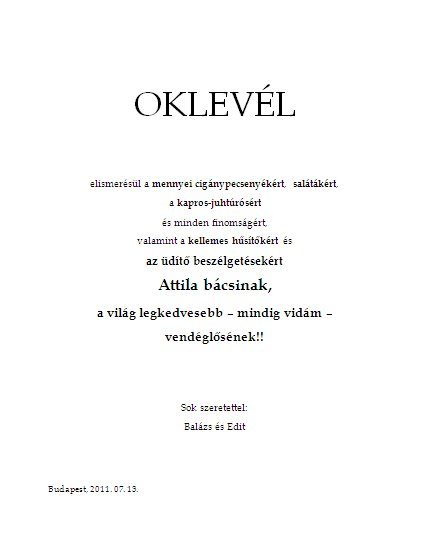 ...most mégis gyártottam egy oklevelet annak az embernek, akihez fél órán belül indulunk "utolsó ebédre", s aki a múlt héten könnyes szemmel felajánlotta, hogy inkább örökbe fogad minket, mert úgy legalább biztosan találkozunk még...